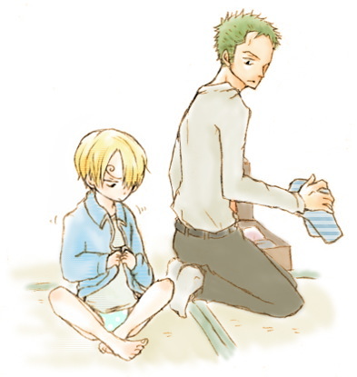 今日から、子供を預かることになった。 名前はサンジ。歳は六歳。本当なら小学校に通い始める年齢だ。 見た目は六歳にしては少し幼い、大きな海のような色の目と、きらきらの髪。 くいなに連れてこられた時、サンジはその大きな瞳に涙をいっぱいにして、それでも泣くまいと唇を噛んで必死で堪えていた。 独りになる孤独感、誰かに頼りたいと思う弱さ、けれどどうにもならない現実。 目の前の小さな子供は、立ちはだかる冷たい現実を見上げて悔し涙を溢れさせた。 その姿がどこか、過去の自分と重なって見えて、見捨てることができなかったのだ。 (しかし…) 正直ゾロには小さな子供をどう扱っていいのかさっぱり分からない。 兄弟は姉しかおらず、随分昔に巻き込まれた事故で死別したし、子供に好かれるタイプでもない。 さてどうしたものか、と中身と見た目がチグハグな子供を目の前に内心冷や冷やしているゾロに、サンジが唐突に告げた。 「おれ、着替える」 唯一サンジの荷物である小さなキャリーケースの中から、真新しいスカイブルーのジャージを小さな手が探し出す。 脱ぎ去った堅苦しい服をぐちゃりと床に放置して、サンジはおぼつかない手つきでジャージの袖に腕を通す。 いかにも高級そうな洋服は適当に放り出したままで、さっそく皺くちゃになっている。 言動はやたら大人びているし生意気だが、こんなところはまだてんで子供だ。 そう思うと安堵して、ゾロはサンジのとなりに膝を折って、その手元を微笑ましく見つめた。 「それはシャンクスが買ってくれたのか?」 「内緒だ」 とにかく会話を繋いでこの子供と打ち解けることから始めようと、あまり得意ではない話術を駆使してサンジに話しかけてみる。 どこか誇らしげに言うサンジの様子は、おもちゃを買ってもらった子供がくすぐったい喜びを隠している様とよく似ている。 上手くジャージを羽織り、次にファスナーを閉めにかかる。 けれどどうにも上手くはまらないらしく、チャックはかちゃかちゃと音を鳴らすだけで、上手くいかないことに苛立ってサンジは眉をぎゅっと中央に寄せた。 ![]() 「んーー」 「貸してみろ」 「わっ」 サンジの手からチャックを奪い、慣れた手つきでさっと前を閉じると、サンジは驚きに瞳を丸くして不思議なものを見るように頬を少し綻ばせた。 ついでにキャリーの中から揃いのズボンを取り出すと、未だにファスナーとにらめっこをしていたサンジがゾロを仰ぎ見ながら、唇をアヒルのように尖らせた。 「使用人は、そんなしゃべり方はしないぞ」 「俺は使用人じゃねぇからな。お前を守る男だ」 綺麗に折りたたまれたズボンをびろんと広げながら、サンジの大きな瞳を真っ直ぐ見た。 この子供を見ていると、かつて突然独りにされた自分の孤独な姿を思い出す。 なんとか守ってやりたい。こんなに小さな子が誰にも頼れず、甘えられず、打ちひしがれる孤独感を知る必要なんてない。 当たり前に言ってのけると、サンジはきょとんとゾロを見返しながら、大きく数回瞬いた。 「…そうか」 「ああ、そうだ。ほら、ズボンはいたら寝るぞ」 「うん」 広げたズボンを差し出しながらニヤリと笑ってみせると、サンジはむずがるようにもじもじと体を揺らしてから、立ち上がってズボンの穴に足を突っ込んだ。 |